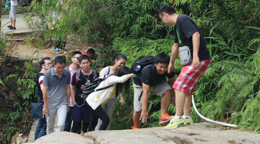 我們的探險之旅始于山底溪谷,沿溪流溯溪而上,這條線路是登馬巒山所有線路中最險要的一條。馬巒山山谷全以石為底,犬牙交錯,落差毗連,溪流迂回曲折,沿著溪谷爬行,一路攀巖附壁,入洞涉溪,驚險又浪漫刺激。艱險的路程絲毫沒有阻擋中航人迎難而上的決心和勇氣,穿草叢、攀巖石、過溪流、走峽谷,行進的旗幟在山谷獵獵飄揚。在登山的過程中,很多同事自告奮勇地積極承擔(dān)起“拉手”的角色,一路上幫扶其他同事,在最前面和最危險的地方伸出他們熱情的雙手,及時的拉一把、幫一把,讓團隊里的每一個人都成功地通過難關(guān)、險關(guān),最終在體驗中成功的登上了馬巒山山頂。