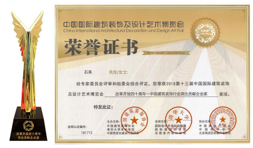 ? ? ??近日,由中國(guó)建筑裝飾協(xié)會(huì)與清華大學(xué)美術(shù)學(xué)院聯(lián)合主辦的第十三屆中國(guó)國(guó)際建筑裝飾及設(shè)計(jì)藝術(shù)博覽會(huì)在北京國(guó)際會(huì)議中心舉行,在本次博覽會(huì)上,中航裝飾被授予“改革開(kāi)放四十周年~中國(guó)建筑裝飾行業(yè)突出貢獻(xiàn)企業(yè)”稱(chēng)號(hào),中航裝飾集團(tuán)石英董事長(zhǎng)被評(píng)為“改革開(kāi)放四十周年~中國(guó)建筑裝飾行業(yè)突出貢獻(xiàn)企業(yè)家”。